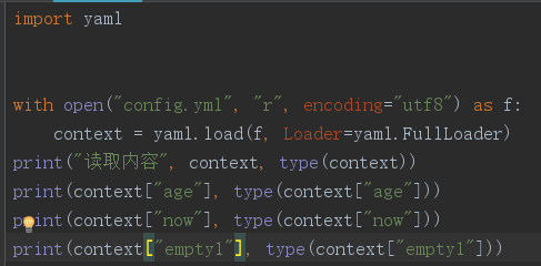 从输出结果及yaml读取文件内容可以看到,输出的内容是一个字典类型,yaml文件中存储的字符串输出仍是字符串类型,int型仍是int型等,存储None类型可以使用null,~符号以及None,这也是区别ini配置文件的地方,且文件内容使用[key:value]的形式定义,当然key和value也可以使用双引号修饰;