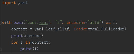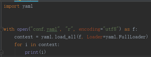 5.读取一组数据时,直接使用load(stream, loader)方法, 读取多组数据时需要使用load_all(stream, loader)方法,此方法返回的是一个生成器,需要使用for循环读取每一组数据,还需要注意两个方法中的最好像我代码中一样传递loader参数为FullLoader,否则会报Warnning