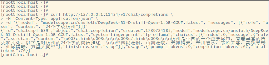 curl http://127.0.0.1:11434/v1/chat/completions \ -H "Content-Type: application/json" \ -d '{"model": "modelscope.cn/unsloth/DeepSeek-R1-Distill-Qwen-1.5B-GGUF:latest", "messages": [{"role": "user", "content": "24个字说杭州"}]}'