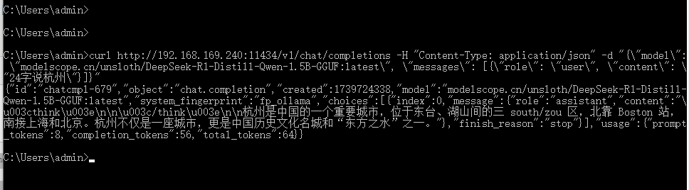 curl http://192.168.169.111:11434/v1/chat/completions -H "Content-Type: application/json" -d "{\"model\": \"modelscope.cn/unsloth/DeepSeek-R1-Distill-Qwen-1.5B-GGUF:latest\", \"messages\": [{\"role\": \"user\", \"content\": \"24字说杭州\"}]}"