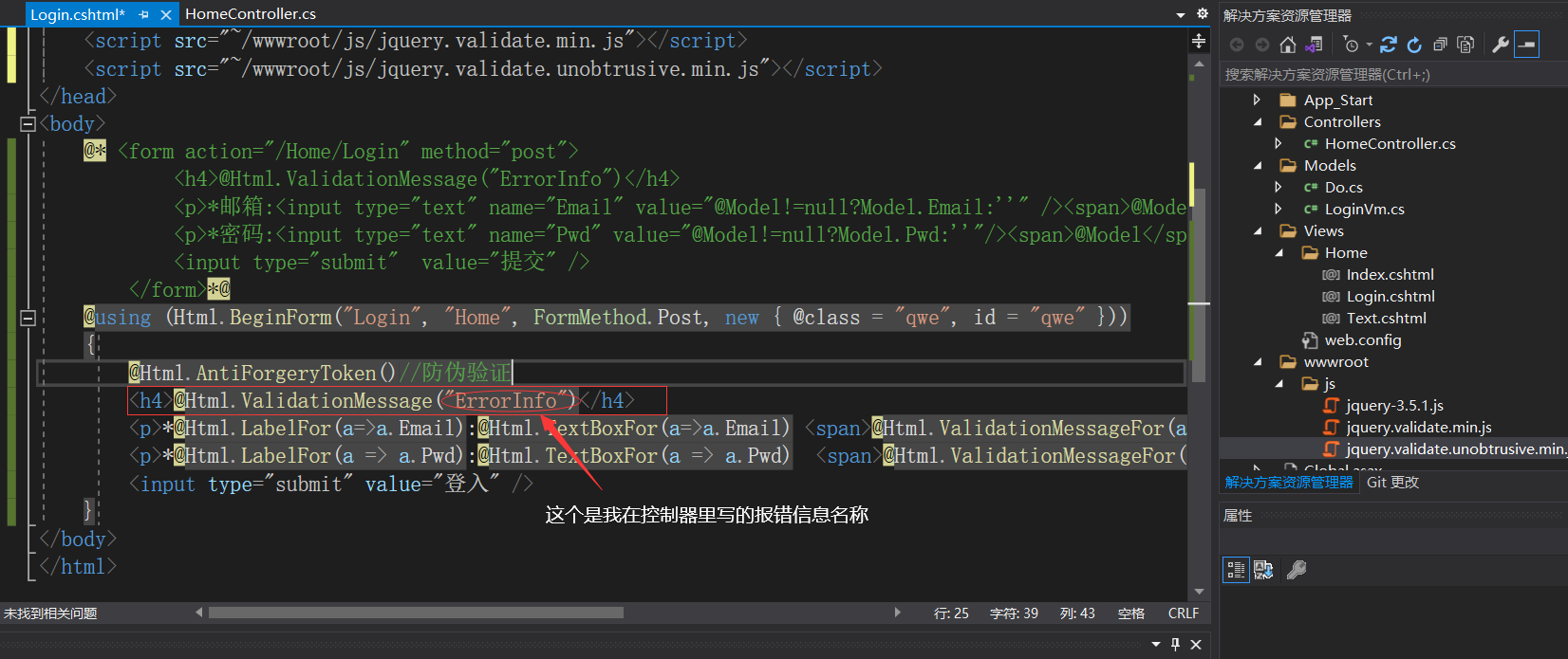 · (@Html.ValidationMessageFor()加载特性标签数据,生成校验规则和错误信息提示)