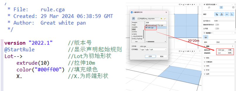 CityEngine 可将注记 @StartRule识别为初始规则,因此在将规则文件分配给初始形状时无需手动指定初始规则。
