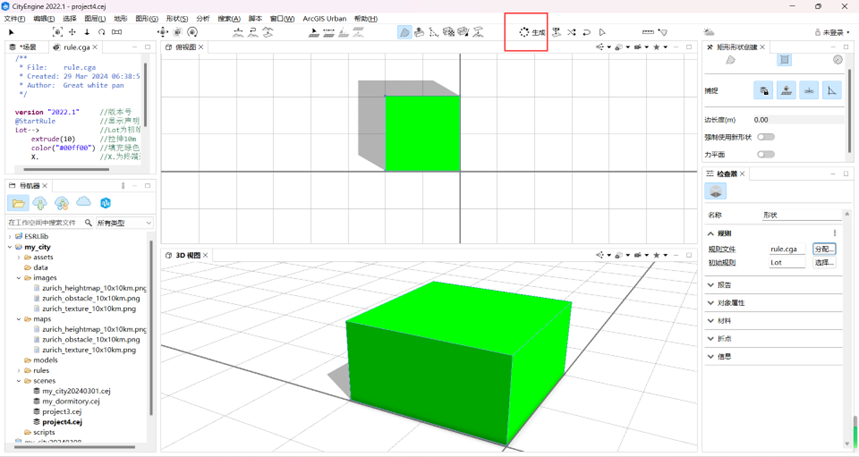 本次实验将创建一个简单的规则文件,以熟悉CGA规则文件的使用方法,包括起始规则的声明等,将其应用于初始形状并生成模型。