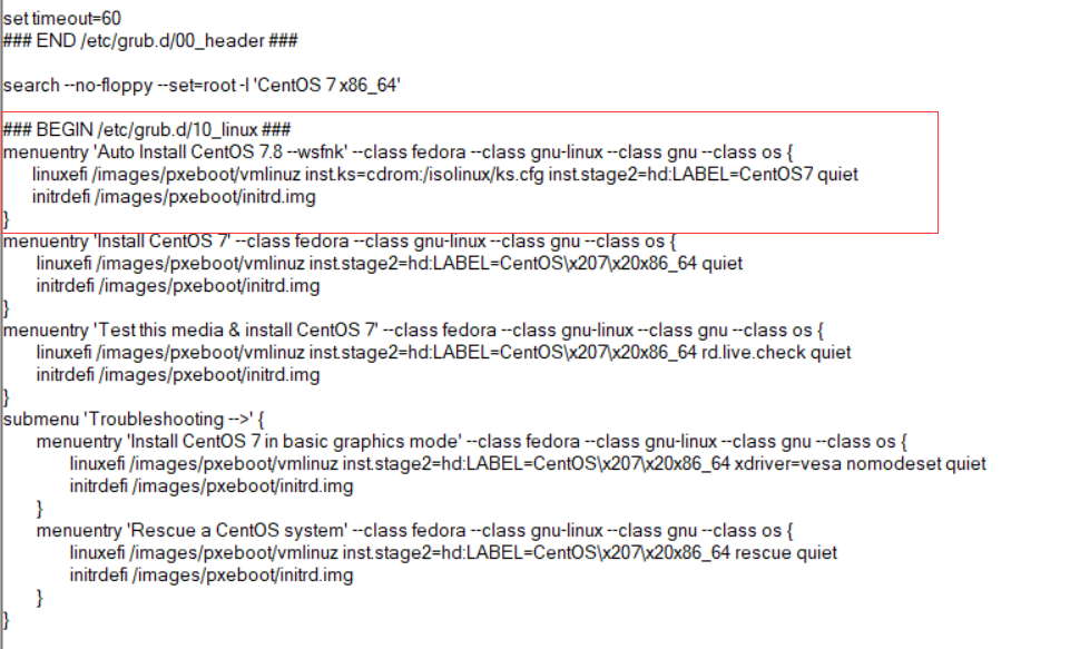 修改EFI/BOOT/grub.cfg文件:增加安装菜单选项