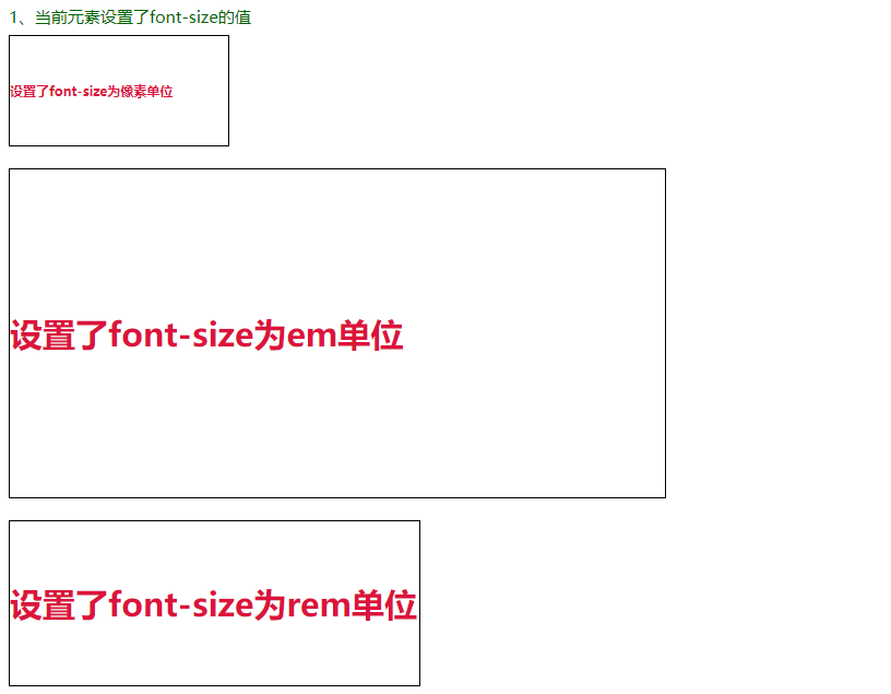 <div style="color: darkgreen;"> 1、当前元素设置了font-size的值 <h1 style="font-size:10px; width: 20em;height: 10em;border: 1px solid #000; color: crimson;line-height: 10em;"> 设置了font-size为像素单位 </h1> <h1 style="font-size:2em; width: 20em; height: 10em;border: 1px solid #000; color: crimson;line-height: 10em;"> 设置了font-size为em单位 </h1> <h1 style="font-size:2rem; width: 25rem; height: 10rem;border: 1px solid #000; color: crimson;line-height: 10rem;"> 设置了font-size为rem单位 </h1> </div> <style> html { font-size: 15px; } </style>