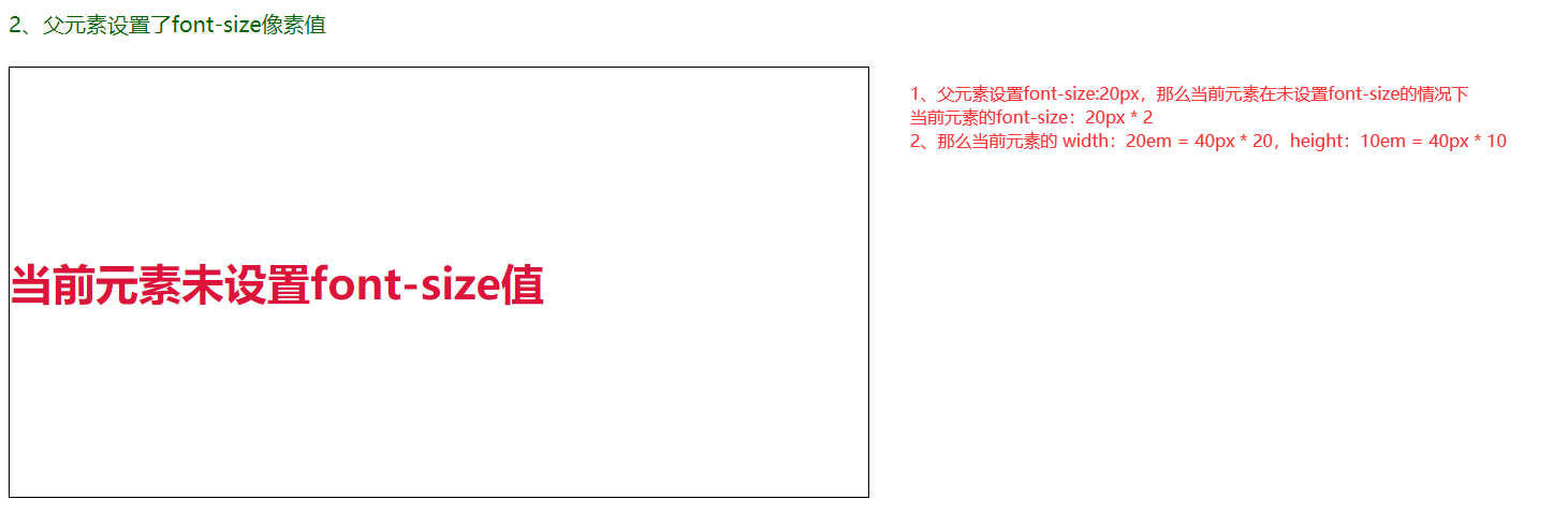 <div style="font-size:20px;color: darkgreen;"> 2、父元素设置了font-size像素值 <h1 style="width: 20em; height: 10em; border: 1px solid #000; color: crimson;line-height: 10em;"> 当前元素未设置font-size值 </h1> </div>