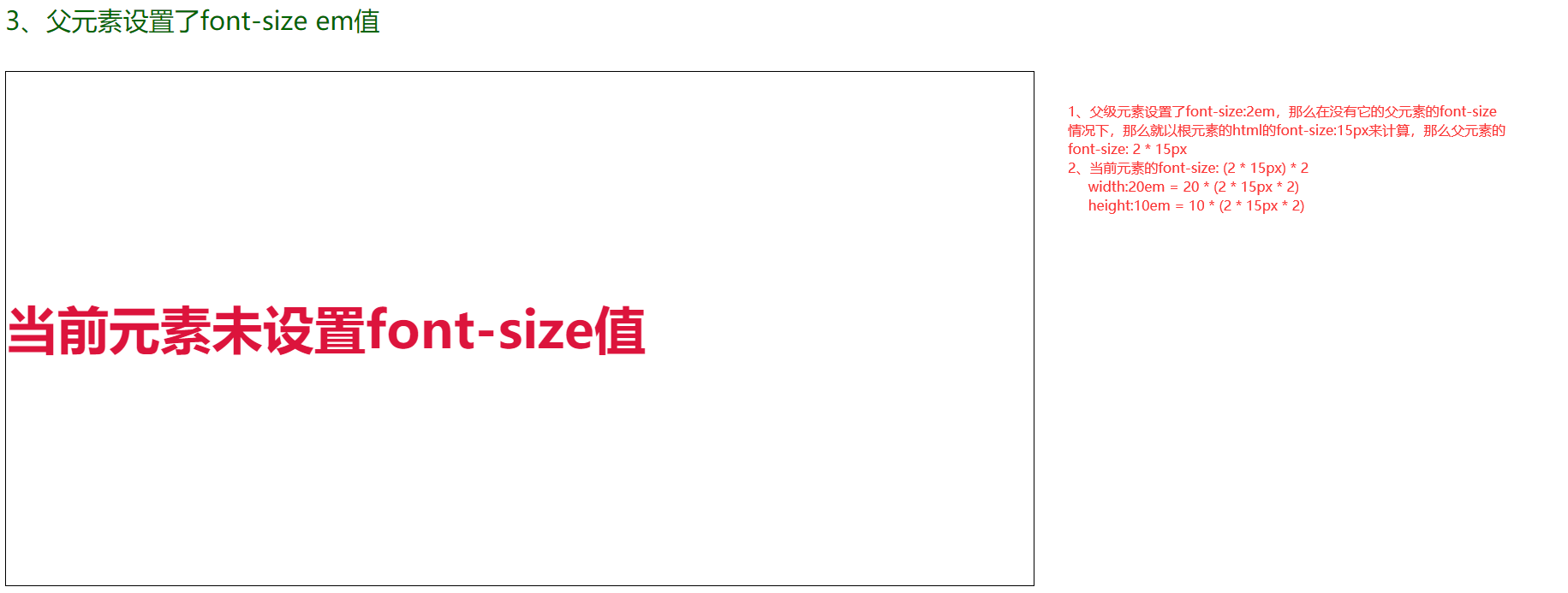 <div style="font-size:2em;color: darkgreen;"> 3、父元素设置了font-size em值 <h1 style="width: 20em; height: 10em; border: 1px solid #000; color: crimson;line-height: 10em;"> 当前元素未设置font-size值 </h1> </div>
