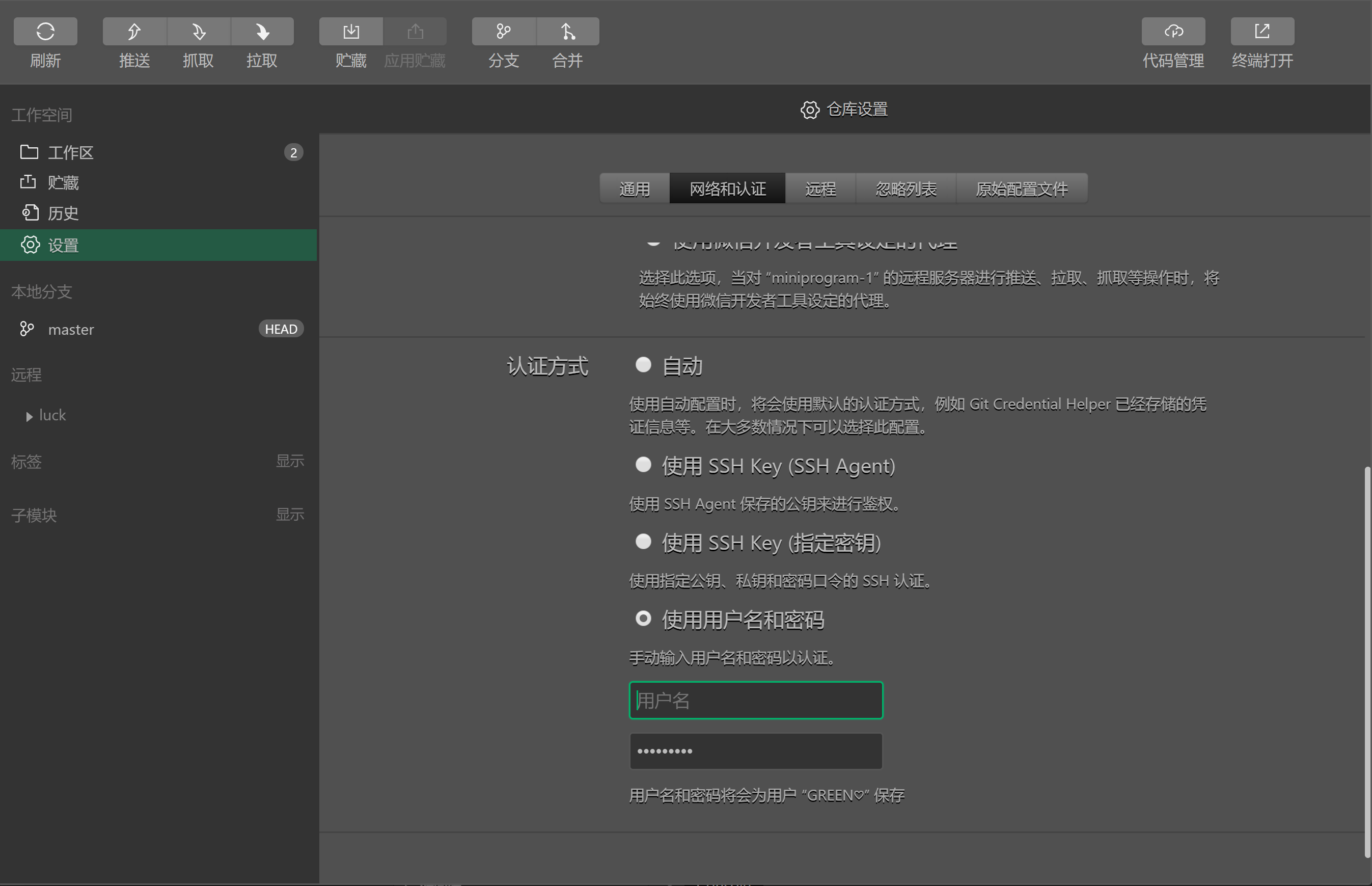 3.点击左边工作空间里的设置,在‘网络和认证’中配置好认证方式,密钥和账号都可以,再到‘远程’里配置好你的远程仓库