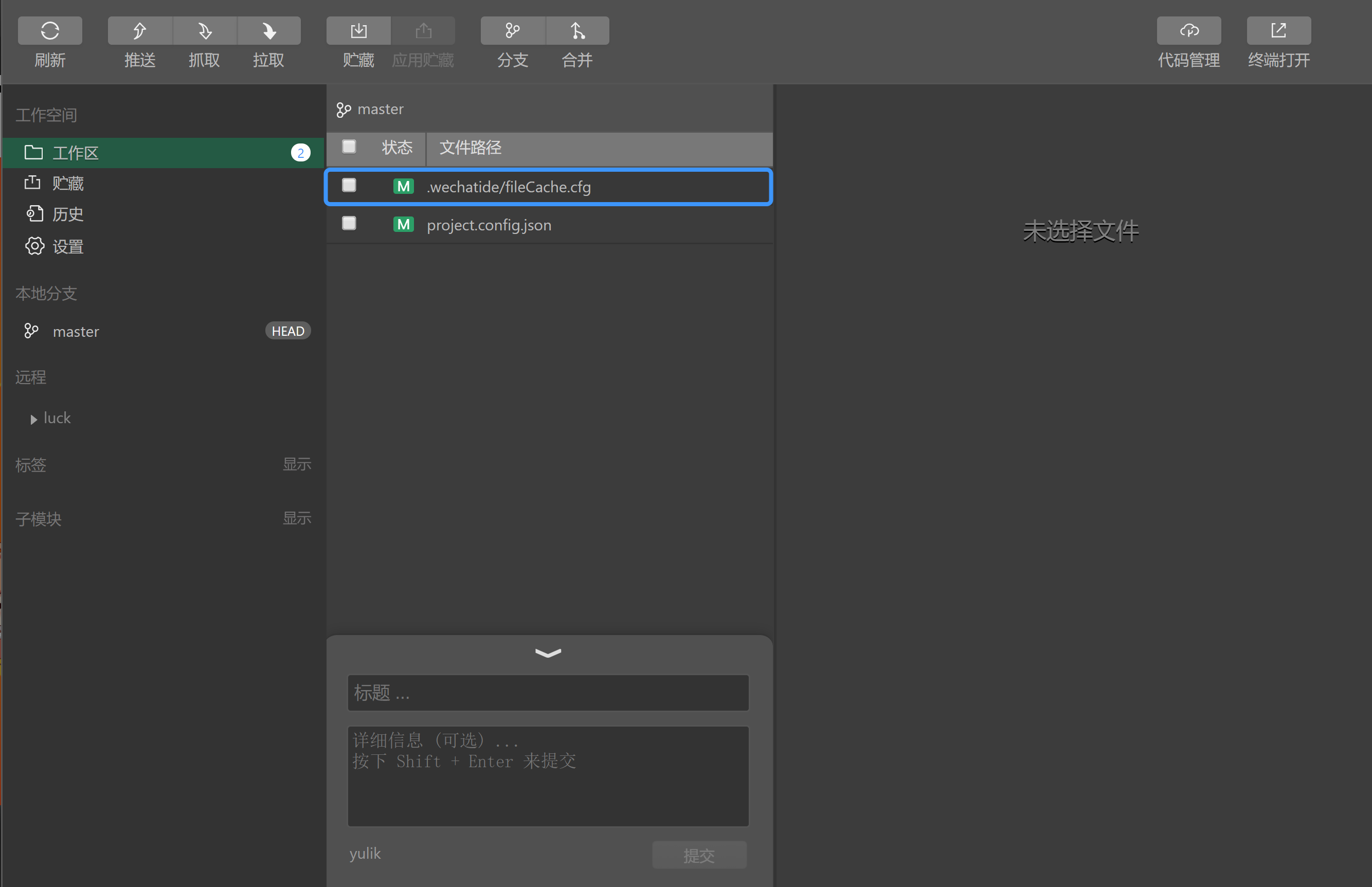 5.更新的话就要先在工作区选择需要推送的代码文件,填写好标题,确认之后就会推送到本地仓库,再选择右上角的推送,将本地仓库的代码更新到远程仓库