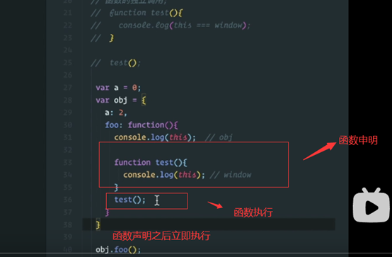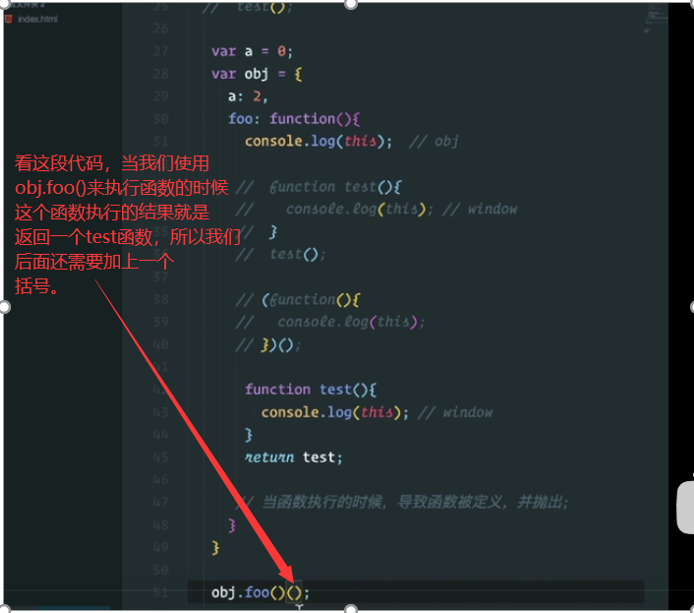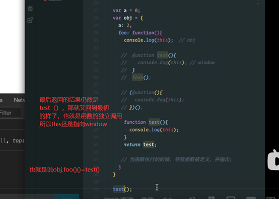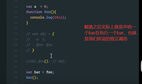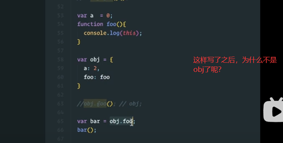 虽然给了一个对象,但是并没有执行。我们再观察这个this指向的时候,一定要抓住这个函数在哪里执行的。所以这个bar指向window。我们只看这个this指向的时候,一定要看当前这个函数是怎么执行的!!!!如果是独立执行的,就是window,如果是对象调用,那么就是对象obj。