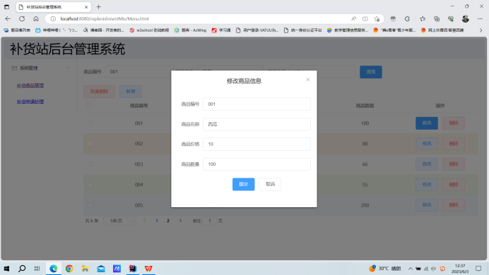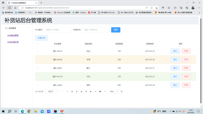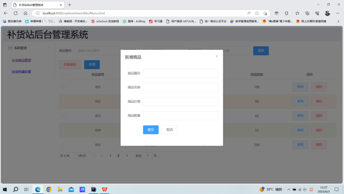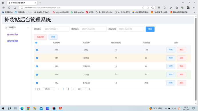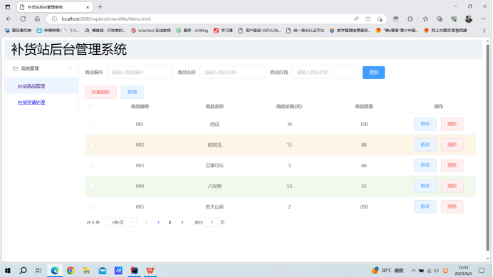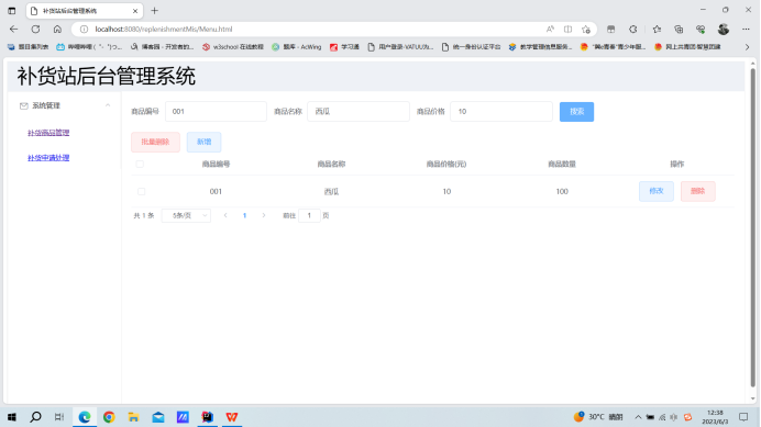 首先是管理员登录后的首页,总共分为补货商品管理以及补货申请管理,接下来展示补货商品管理界面