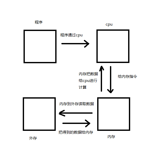 程序让cpu给内存指令让内存到外存读取数据至内存到cpu计算
