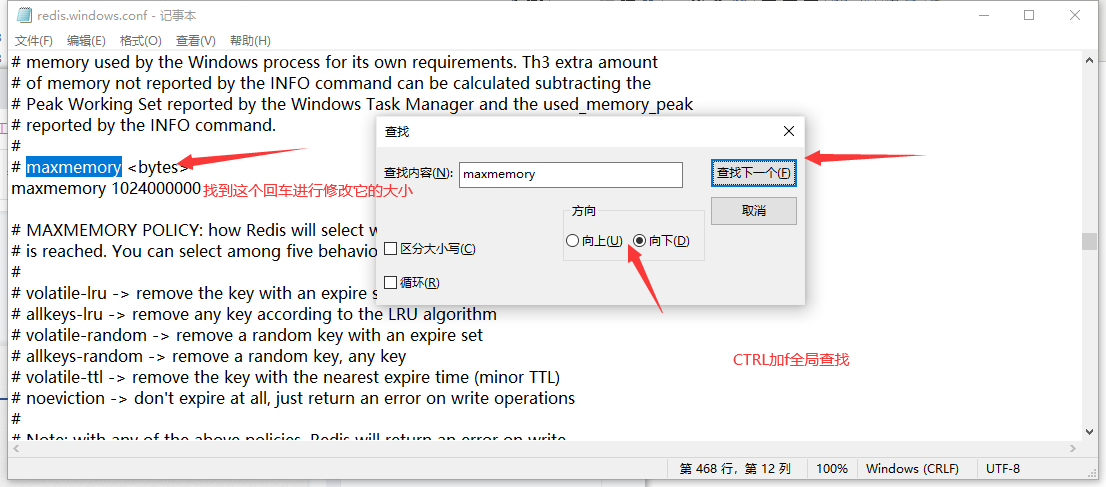 打开redis.windows.conf这个文件,进行设置maxmemory