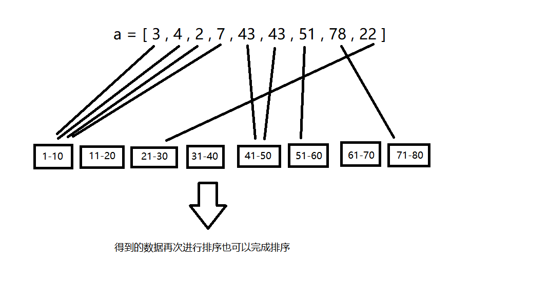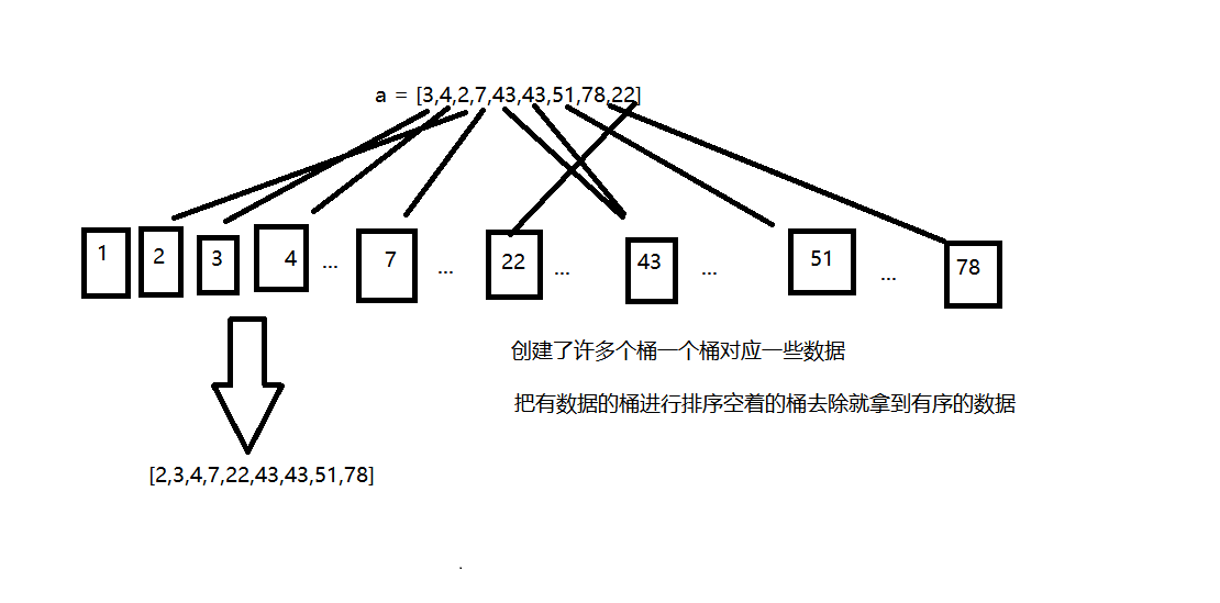 首先讲一下桶排序,桶排序顾名思义用桶来排序,当然不是家用的桶,用的是容器型数据来进行储存,桶排序的想法是进行规划范围来进行创建容器型数据,比如说规划0-100的范围内来进行创建,他就会创建一百个容器,一个容器对应一个数据