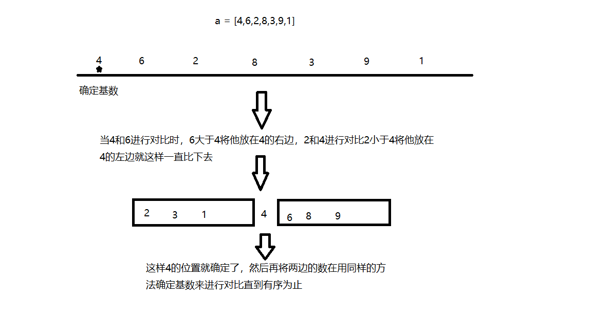 快速排序会在一个容器型数据类型中踢出一个元素作为基数(通常是开头和尾部),将基数和其他的数进行对比如果比基数大的话,放在一个容器中,如果比基数小的话放在一个容器中,对比完了之后基数的位置就确定了,然后用同样的方法来将两个存放大的和小的容器在进行对比一直有序为止