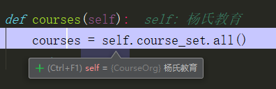 我们可以通过Debug来查看它的属性self就是一个对象它就是a表,course_set注意它是一个动态的名字,可以把它理解为Django中的object,然后进行all取值,那它的名字是如何来的呢