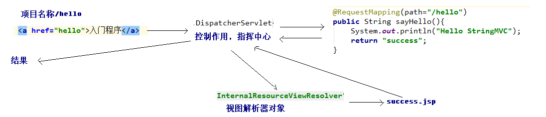 通俗点的解释:就是通过一个超链接或者一个表单,向DispatcherServlet发起http请求;然后这个控制器就会去调用Controller类中的方法。拿到数据后,控制器再调用视图解析器,将结果封装到另一个jsp页面,最后输出在控制台。
