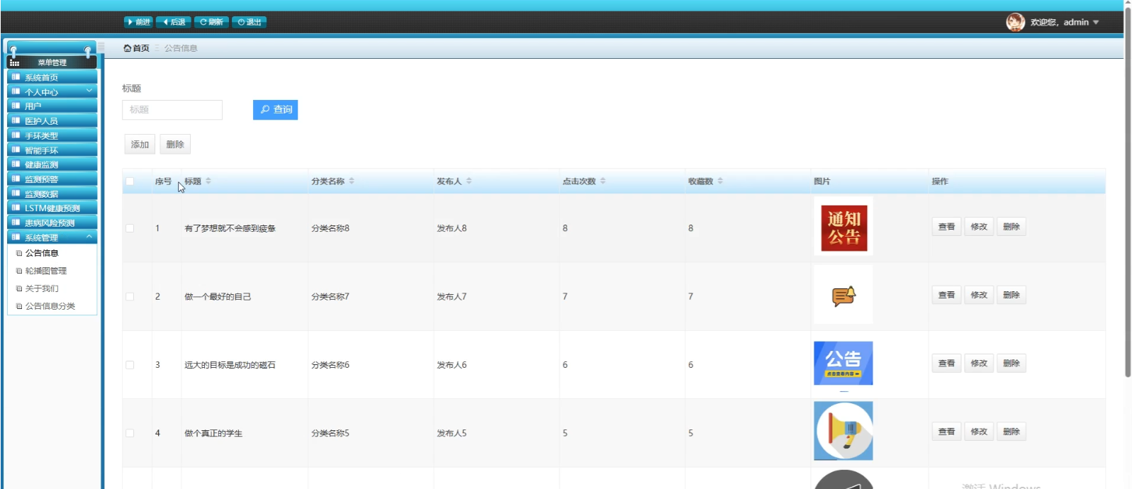 系统管理模块包含公告信息、轮播图管理、关于大家及公告信息分类等功能。管理员可经过该模块发布最新的健康资讯或架构通知,维护首页轮播图内容以增强信息传播效果,并编辑“关于我们”页面以介绍框架的背景与服务宗旨。同时,环境承受对公告信息进行分类管理,便于用户高效查找所需信息,提升使用便捷性与信息获取效率。