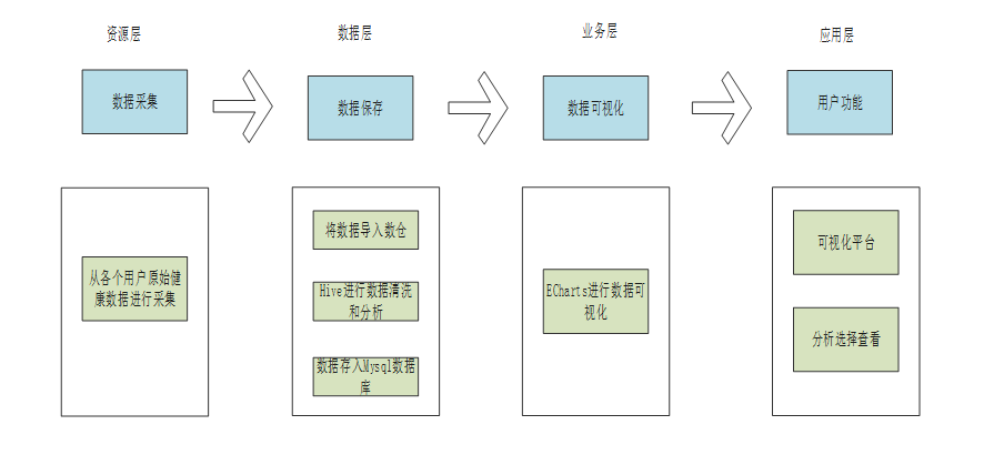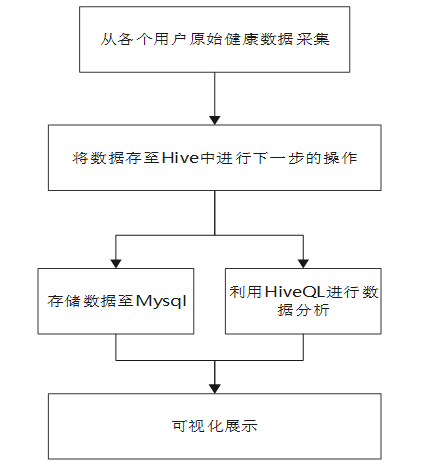 本大数据分析智能健康监测系统系统通过从用户的智能手环的监测获取数据,并在Hive中对信息进行清洗和分析,然后将其存储到MySQL数据库中。再利用HiveQL语言对数据进行分析,最终将数据以及分析后的结果送到ECharts中调用这些素材,对分析结果以及预测信息进行可视化展示。