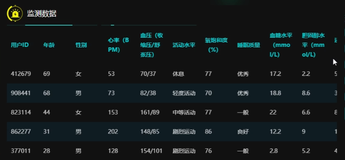 监测数据页面展示了不同用户的健康指标,包括心率、血压、活动水平、氧饱和度、睡眠质量、血糖水平和胆固醇水平等关键生理参数。例如,用户ID为412679的69岁女性,其心率为53 BPM,血压为70/37 mmHg,处于休息状态,氧饱和度为77%,睡眠质量优秀,血糖水平为17.2 mmol/L,胆固醇水平为2.2 mmol/L。通过这些详细的数据记录,系统能够全面监控用户的健康状况,援助医护人员及时发现异常并采取相应措施,同时为用户献出个性化的健康管理建议。