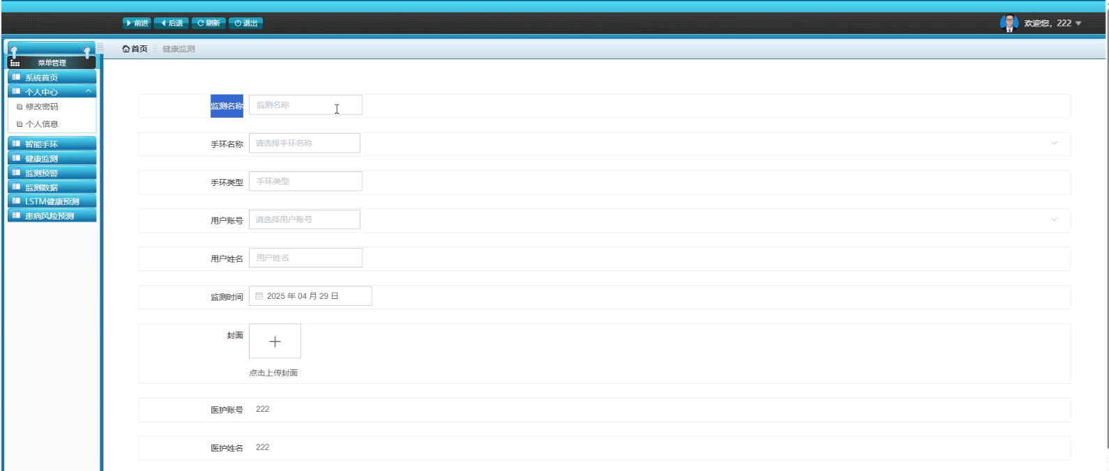 This system is based on Python language, combined with Spark framework and Hadoop for big data processing. The front-end uses Django framework to build a user-friendly interface. The system can collect real-time health data including oxygen saturation, cholesterol levels, blood glucose levels, etc., and predict the user's disease risk through random forest regression algorithm, providing personalized health management suggestions for users. At the same time, the use of the Django framework has improved the system's scalability and maintainability, making it easier to add and optimize subsequent features. The system also uses LSTM models to achieve health prediction, helping medical staff identify potential health risks early and make more scientific decisions. Through this system, users can obtain comprehensive and accurate health status monitoring, and medical staff can manage health data more efficiently, improving the overall quality of medical services.