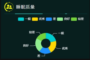 睡眠质量分析功能通过直观的饼图展示了用户的睡眠状况分布,协助用户和医护人员清晰了解整体睡眠质量。饼图以不同颜色区分了睡眠质量的五个等级:较差(绿色)、差(蓝色)、一般(浅蓝色)、良好(浅绿色)和优秀(黄色)。例如,图表显示大部分用户的睡眠质量处于良好或优秀的水平,而少部分用户则需要关注和改善其较差或差的睡眠状态。这种可视化展示不仅便于快速识别睡眠问题,还为制定针对性的睡眠改善计划提供了科学依据,有助于提升用户的整体健康水平。