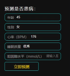 患病风险预测功能基于随机森林回归算法,结合用户年龄、性别、心率、睡眠质量、胆固醇水平等资料,以可视化图表形式展示健康风险评分或概率分布,帮助用户直观了解自身患病风险。该功能不仅提升健康认知,也为个性化健康管理提供科学依据。