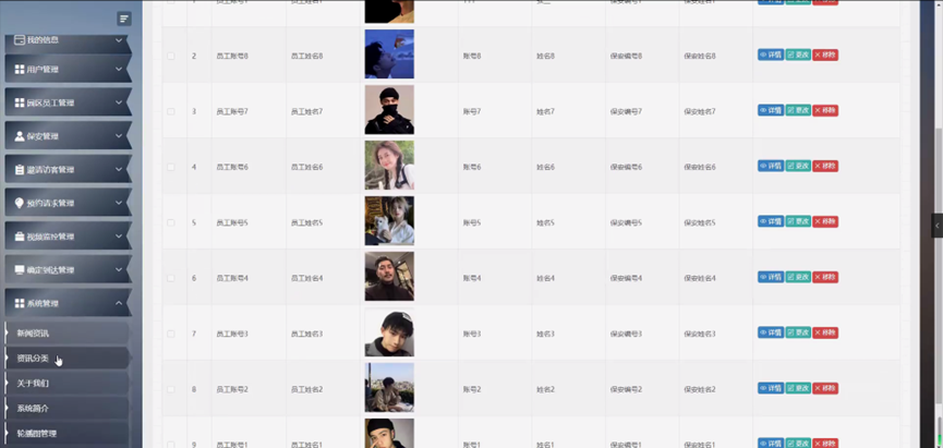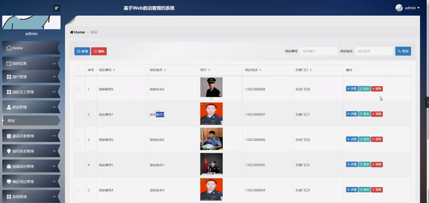 保安功能在视图层(view层)进行交互,比如点击“搜索、新增或删除”按钮或填写保安信息表单。这些保安表单动作被视图层捕获并作为请求发送给相应的控制器层(controller层)。控制器接收到这些请求后,调用服务层(service层)以执行相关的业务逻辑,例如验证输入数据的有效性和与数据库的交互。服务层处理完这些逻辑后,进一步与资料访问对象层(DAO层)交互,后者负责具体的数据操作如详情、更改或移除保安信息,并将操作结果返回给控制器。最终,控制器根据这些结果更新视图层,以便保安能力可能看到最新的信息或相应的操作反馈。保安界面如图5-9所示:
