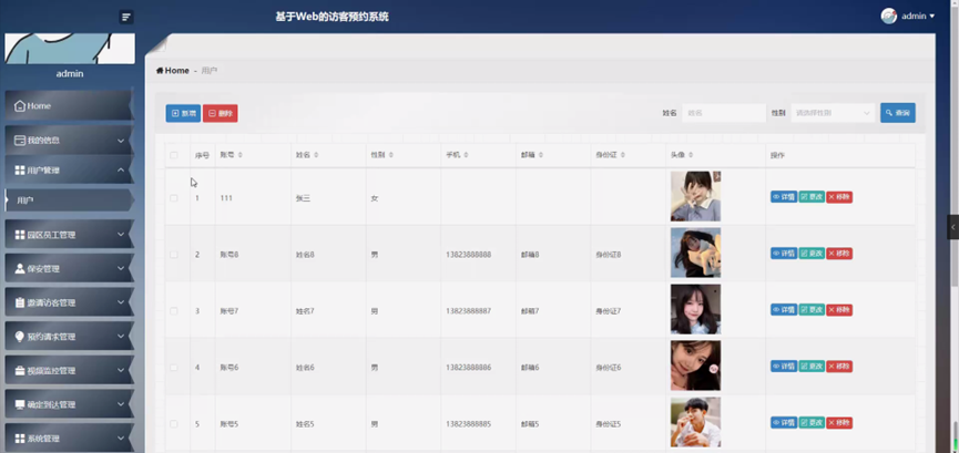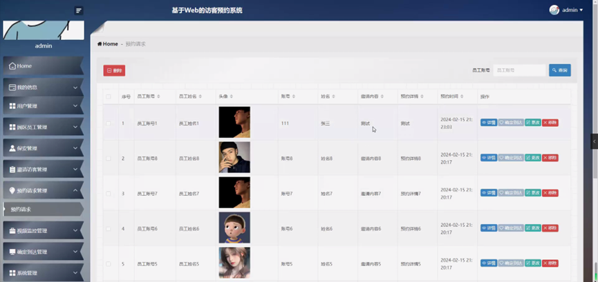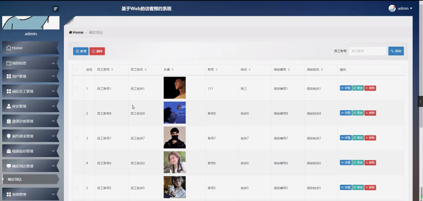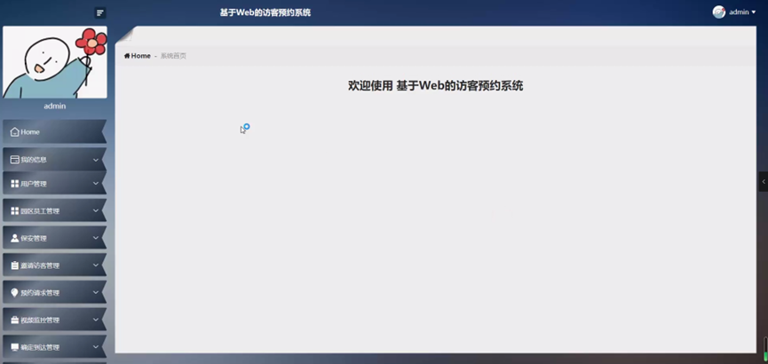 管理员进入主页面,主要功能包括对系统首页、我的信息、用户管理、园区员工管理、保安管理、邀请访客管理、预约请求管理、视频监控管理、确定到达管理等进行操作。管理员主页面如图5-7所示: