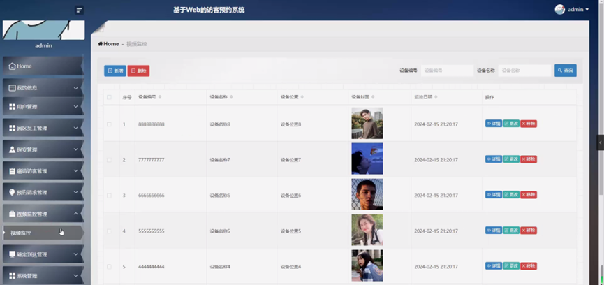 视频监控功能在视图层(view层)进行交互,比如点击“搜索、新增或删除”按钮或填写视频监控信息表单。这些视频监控表单动作被视图层捕获并作为请求发送给相应的控制器层(controller层)。控制器接收到这些请求后,调用服务层(service层)以执行相关的业务逻辑,例如验证输入信息的有效性和与数据库的交互。服务层处理完这些逻辑后,进一步与数据访问对象层(DAO层)交互,后者负责具体的数据操作如详情、更改或移除视频监控信息,并将操作结果返回给控制器。最终,控制器根据这些结果更新视图层,以便视频监控功能可以看到最新的信息或相应的管理反馈。视频监控界面如图5-12所示: