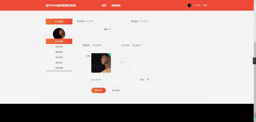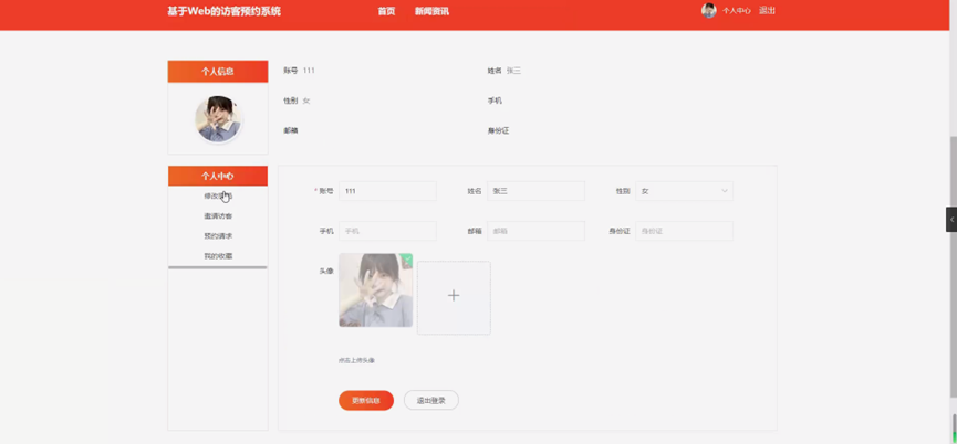 个人中心:在个人中心页面可以对个人中心、修改密码、邀请访客、预约请求、我的收藏进行详细操作;如图5-3所示:
