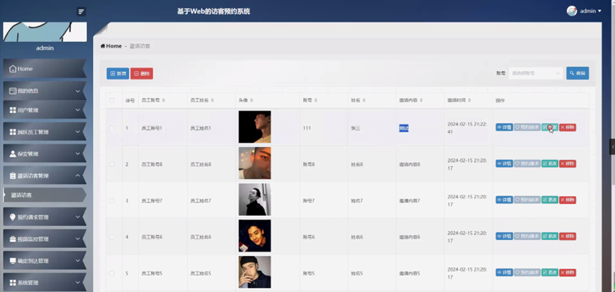 邀请访客功能在视图层(view层)进行交互,比如点击“搜索、新增或删除”按钮或填写邀请访客信息表单。这些邀请访客表单动作被视图层捕获并作为请求发送给相应的控制器层(controller层)。控制器接收到这些请求后,调用服务层(service层)以执行相关的业务逻辑,例如验证输入数据的有效性和与数据库的交互。服务层处理完这些逻辑后,进一步与数据访问对象层(DAO层)交互,后者负责具体的数据操作如详情、更改、预约请求或移除邀请访客信息,并将操作结果返回给控制器。最终,控制器根据这些结果更新视图层,以便邀请访客功能可以看到最新的信息或相应的操作反馈。邀请访客界面如图5-10所示: