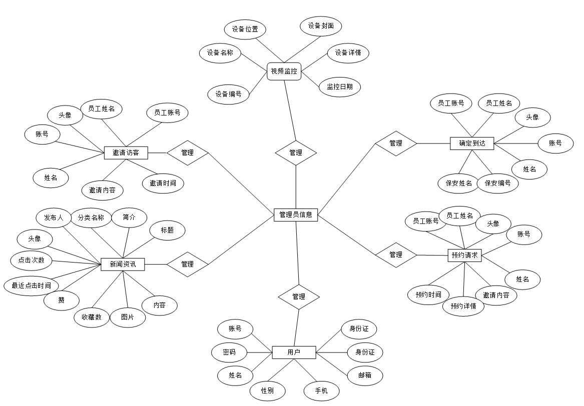 通过对访客预约系统的关键功能信息进行规划并分为若干机制实体信息,实体信息将使用E-R图加以表示,在系统中将对 “新闻资讯、邀请访客、视频监控、确定到达、预约请求、用户”等几个主要的实体属性进行布局,如图4-2所示:
