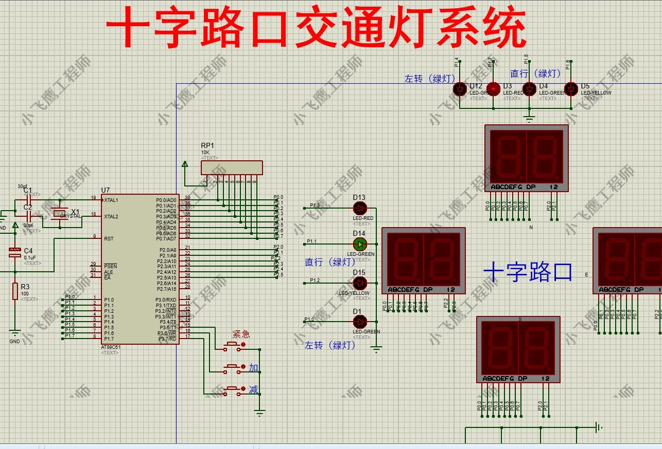 基于单片机十字路口红绿灯交通信号灯环境Proteus仿真(含全部资料)