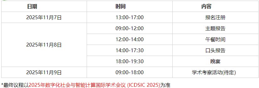 ICDSIC 2025的主要目标是促成跨学科的合作与创新,展示前沿研究成果,探讨数字经济、智慧城市、人工智能等领域的未来趋势。会议将邀请知名专家进行主题演讲,并设立多个分会场,涵盖技术、应用、政策等多个维度,希望能够激发参与者的灵感与思考,推动数字化社会建设与智能计算技术的融合发展。我们诚邀全球学者踊跃参会,共同探索数字时代的美好未来。