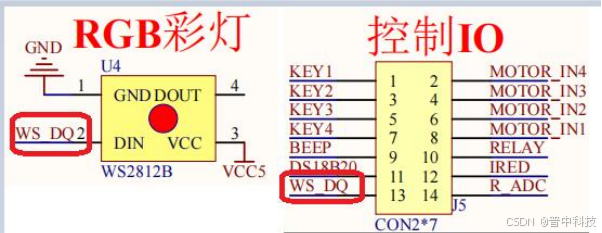 由图可知,J5 端子的 WS_DQ 脚为 RGB 彩灯控制口,可将该引脚与ESP32的GPIO 连接。