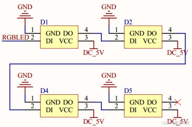 可将多个 RGB 灯珠级联,市面上的 RGB 彩灯带也是这样级联的,如下所示:
