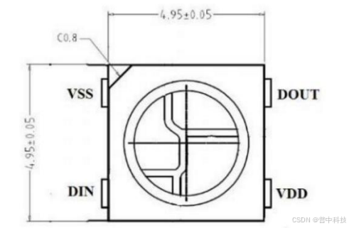 WS2812B 是一款智能控制 LED 光源,控制电路和 RGB 芯片集成在一个5050组件的封装中。内部包括智能数字端口数据锁存器和信号整形放大驱动电路。其管脚图如下: