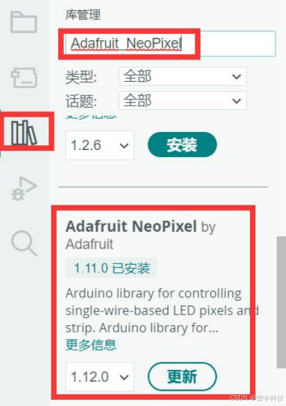WS2812B 是一种常用的 RGB 灯,在 Arduino IDE 平台,可在库管理器中搜索其对应的驱动包,可通过搜索“Adafruit_NeoPixel”安装。如下: