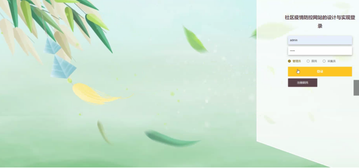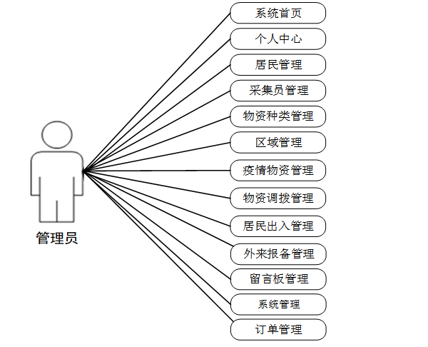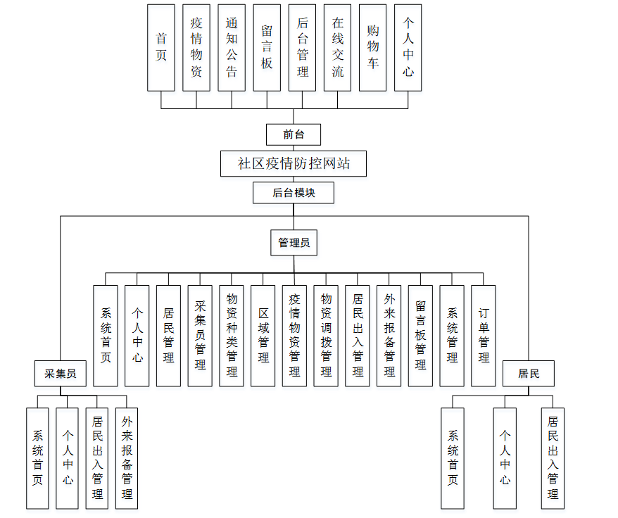 该系统由管理员、采集员和居民三部分组成。其中:采集员和居民进入系统首页可能实现疫情物资、物资调拨、居民出入、外来报备、留言板等;管理员则是根据不同需求设置了不同功能,可以通过后台管理接口管理系统所有信息[9]。