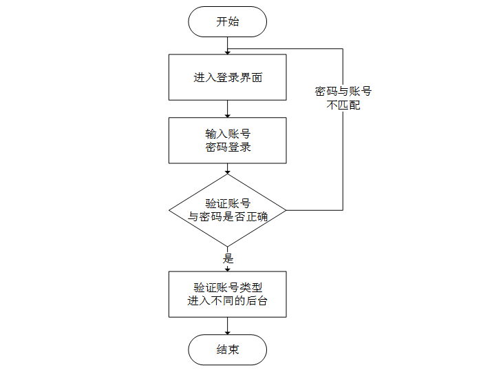 登录流程是该体系的第一个流程,登录的第一步是输入账号、密码登录,系统会验证账号与密码是否正确,正确时系统会判断账号类型再进入不同的后台;不正确时,会返回到登录的第一步,输入用户重新执行登录流程。该流程如图3-4所示。