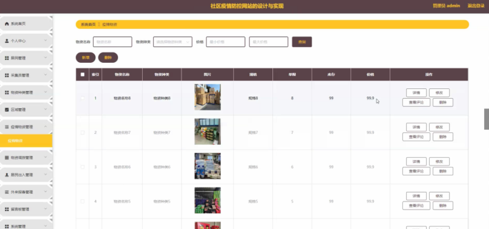 管理员点击疫情物资管理;在疫情物资管理页面对物资名称、物资种类、图片、规格、单限、库存、价格等信息,进行查询、新增或删除疫情物资等操作;如图5-8所示。