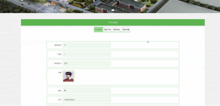 通过在个人中心页面能够输入个人详细信息,进行信息更新操作,还许可对我的订单、我的地址、我的收藏进行详细操控,如图5-4所示: