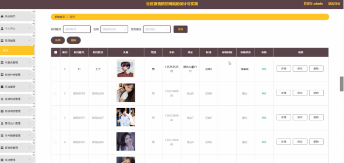 管理员点击居民管理;在居民管理页面对居民账号、居民姓名、头像、性别、手机、地址、区域、审核回复、审核状态、审核等信息,进行查询、新增或删除居民信息等操作;如图5-7所示。