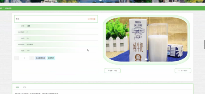 用户点击疫情物资,在疫情物资页面的搜索栏输入物资名称、物资种类,进行查询,然后还可以查看物资名称、物资种类、图片、规格、单限、库存、价格,最后如果有需要可以添加到购物车、立即购买或者收藏、评论等操作;如图5-3所示:
