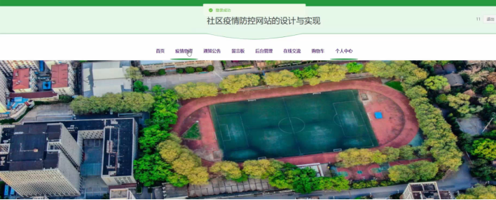 当游客打开框架的网址后,首先看到的就是首页界面。在这里,游客能够看到社区疫情防控网站的导航条显示首页、疫情物资、通知公告、留言板、后台管理、在线交流、购物车、个人中心。系统首页界面如图5-1所示: