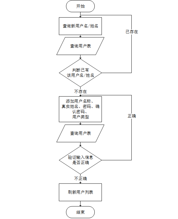 否完整,信息都正确且完整时,返回并刷新用户列表;信息不正确时,会返回输入信息的那一步。该流程如图3-就是添加新用户的流程是先查询新用户名是否已存在,如已有该用户名,需重拟用户名并同时输入新用户的其它信息,添加新用户到数据库时会先验证信息5所示。