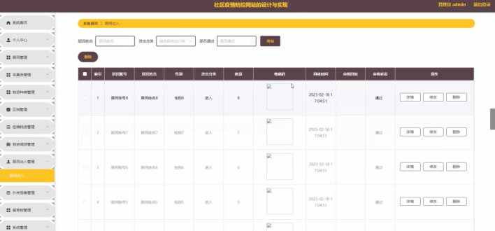 管理员点击居民出入管理;在居民出入管理页面对居民账号、居民姓名、性别、退出分类、体温、粤康码、具体时间、审核回复、审核状态等信息,进行查询或删除居民出入等操作;如图5-10所示。