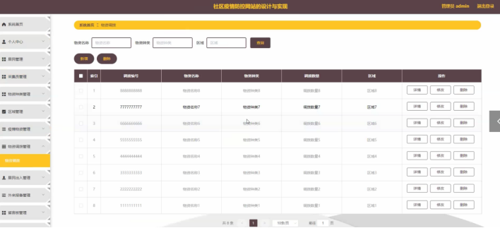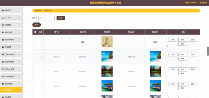 (3)管理员实现个人信息修改,对疫情物资、物资调拨、居民出入、外来报备、留言板等进行修改和删除等操作,