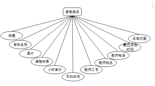 依据对大学生家教平台的主要效果信息进行规划并分为若干功能实体信息,实体信息将使用E-R图加以表示,本系统的首要特性实体图如图4-2、图4-3、图4-4、图4-5、图4-6所示。